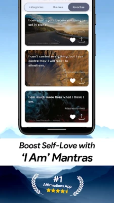 Jelajahi beragam tema yang akan mendukung setiap aspek perjalanan pribadi Anda. Dari dukungan untuk kecemasan dan depresi, pengembangan karier dan produktivitas, hingga manifestasi kelimpahan dan penguatan hubungan, Uplift – Afirmasi Positif menghadirkan puluhan kategori yang terus diperbarui secara rutin. Manfaatkan fitur personalisasi seperti pengingat harian yang lembut langsung di layar utama, simpan afirmasi favorit Anda untuk akses cepat, dan bagikan inspirasi dengan mudah. Setiap sesi semakin diperkaya dengan pilihan latar belakang visual yang menenangkan, menciptakan pengalaman yang benar-benar imersif dan tanpa gangguan.