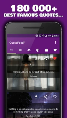 Apakah Anda pernah mencari kata-kata yang dapat menggugah semangat, memberikan kebijaksanaan, atau sekadar menghibur hari Anda? Hadirkan perpustakaan inspirasi tak terbatas di genggaman Anda dengan QuoteFeed™. Aplikasi ini adalah jendela menuju koleksi paling komprehensif, menampilkan lebih dari 180.000+ pilihan kutipan, ucapan, dan status terbaik dari seluruh penjuru dunia. Selami pemikiran mendalam dari 15.000+ penulis terkemuka, mencakup 140+ kebangsaan dan 70+ profesi, memastikan Anda selalu menemukan suara yang relevan dengan setiap momen hidup.