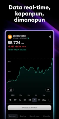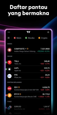 Lebih dari sekadar alat analisis, TradingView adalah komunitas global paling dinamis bagi para trader dan investor. Terhubung dengan jutaan individu berpikiran sama, bertukar ide trading, dan belajar dari pengalaman kolektif untuk memperkaya strategi Anda. Nikmati pengalaman yang mulus dengan sinkronisasi akun, memastikan semua analisis, daftar pantau, dan pengaturan Anda selalu tersedia di perangkat mana pun. TradingView membuka akses ke data real-time dari lebih dari 100.000 instrumen di 50+ bursa global terkemuka dari Amerika hingga Asia dan Eropa, termasuk NASDAQ, NYSE, LSE, dan banyak lagi. Pantau harga komoditas vital seperti emas, perak, dan minyak, serta indeks global dari Dow Jones hingga NIKKEI 225, dan bandingkan harga aset kripto dari bursa-bursa terkemuka.